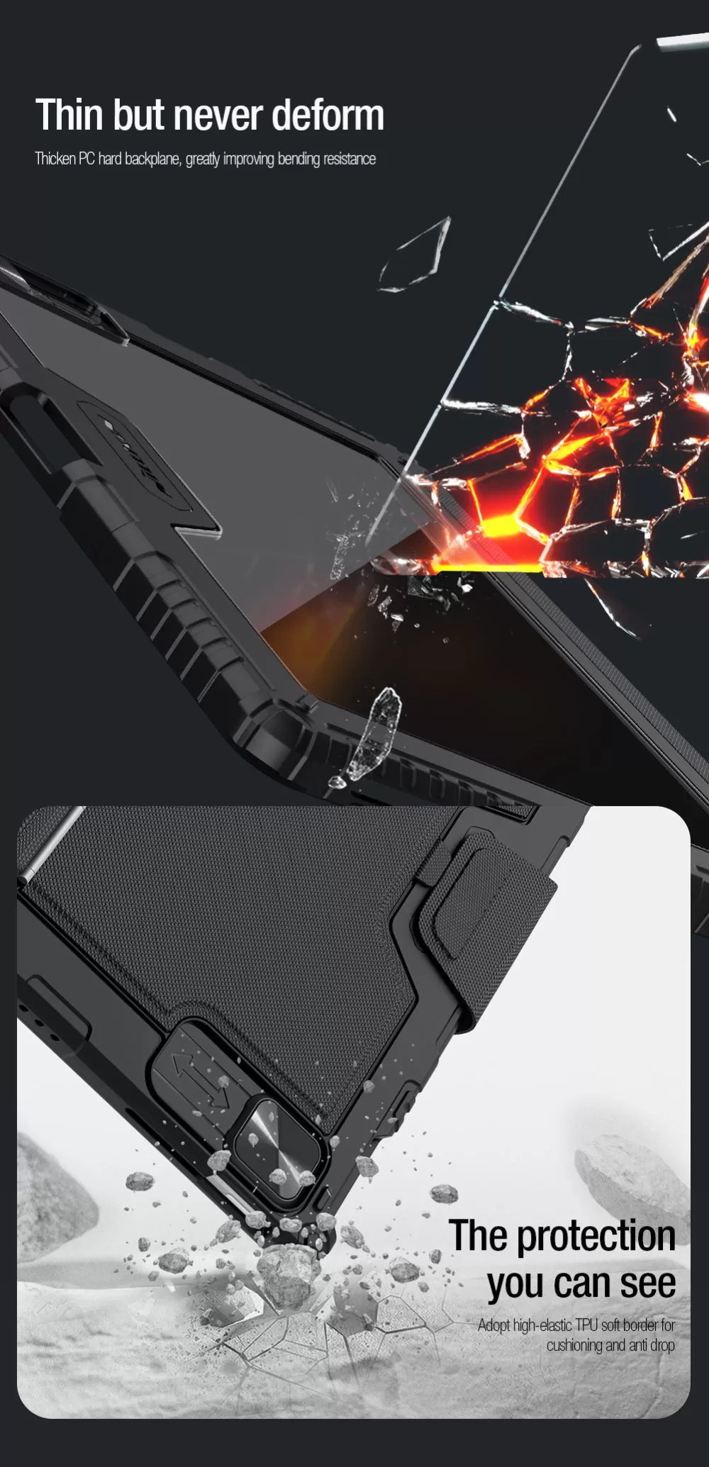 NILLKIN manufactured phone cases and covers for Apple iPad Pro 12.9 (2020) are lightweight and tough. These are 100% original NILLKIN products, which will protect the back of your phone from scratches, will reduce impact shocks and protect from other kinds of damage. Each case and cover has been created to tightly fit around the phone without making it look massive. Allows access to all functions of the phone. NILLKIN offers natural leather, artificial leather, silicone, plastic, carbon fibre, rubber, and TPU cases and covers. The wide range of products includes cases, covers, skins and tempered glass screen protectors of different colours, styles, and designs. Flip cases, sleeves, pouches, holsters, back covers and skins. With a NILLKIN phone case or cover and a tempered glass screen protector your phone will always be safe. Nillkin is a modern and recognized brand, which offers a wide range of mobile phone accessories.